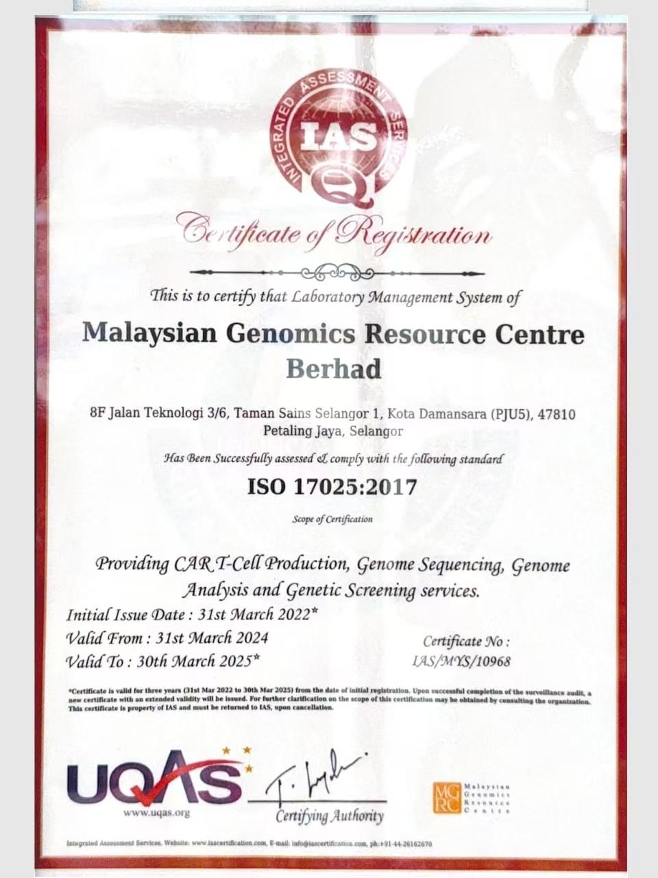 这是马来西亚基因组资源中心有限公司(Malaysian Genomics Resource Centre Berhad)的ISO 9001:2015质量管理体系注册证书,提供CAR - T细胞生产、基因组测序、基因组分析和基因筛查服务,初始发证日期2022年3月31日,有效期从2024年3月31日至2025年3月30日,证书编号IAS/MYS/10972 。