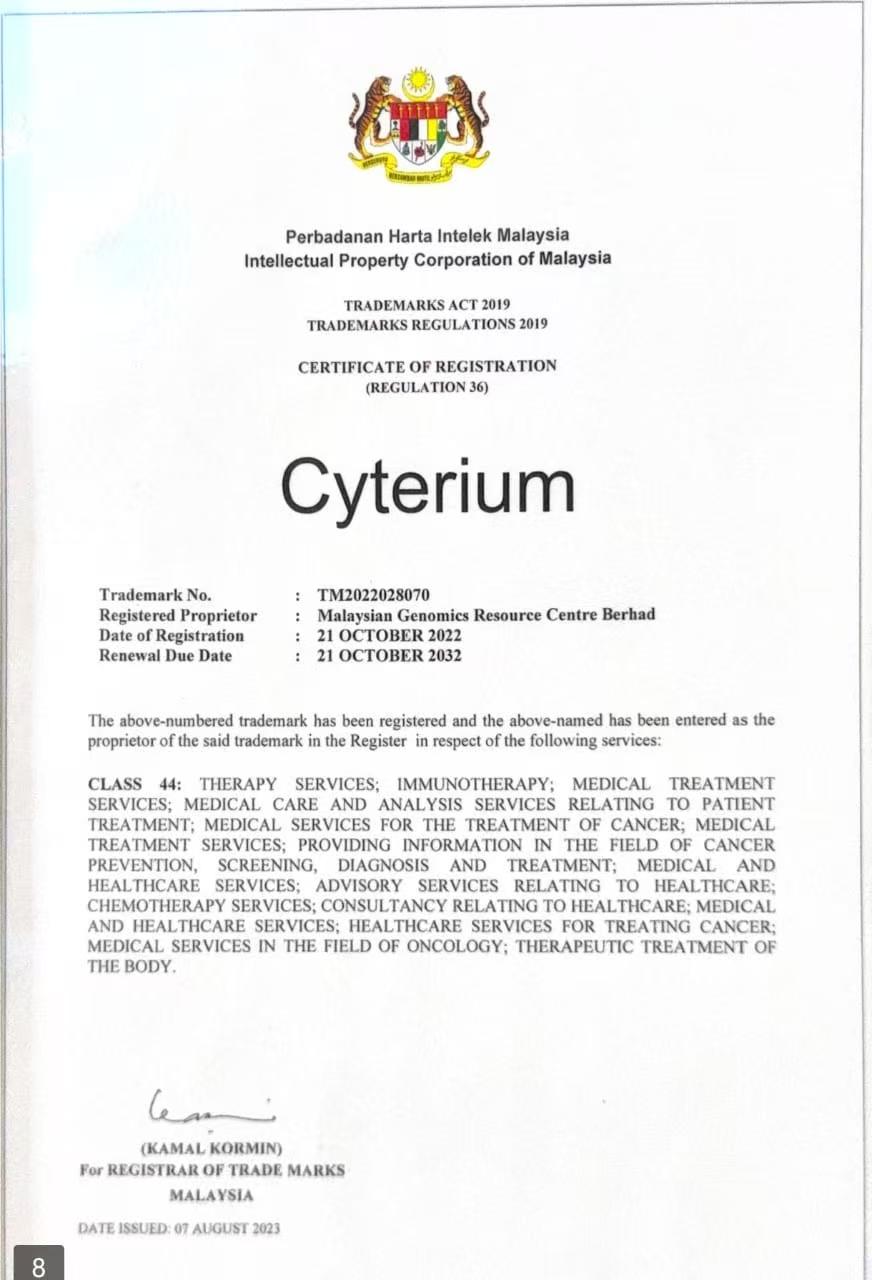 马来西亚知识产权公司颁发给马来西亚基因组资源中心有限公司的“Cy+erium”商标注册证书,注册号TM2022028069,注册日期2022年10月21日,续展日期2032年10月21日,涵盖医疗、癌症治疗等服务类别。