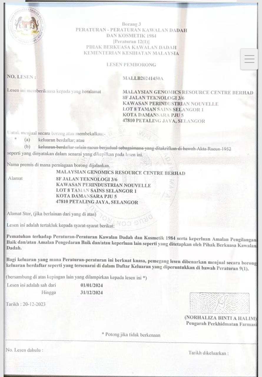 马来西亚基因组资源中心有限公司相关文件,包括UQAS认证、马来西亚卫生部药品及化妆品监管执照(2024年1月1日 - 12月31日有效)、马来西亚知识产权公司商标注册证书相关内容。