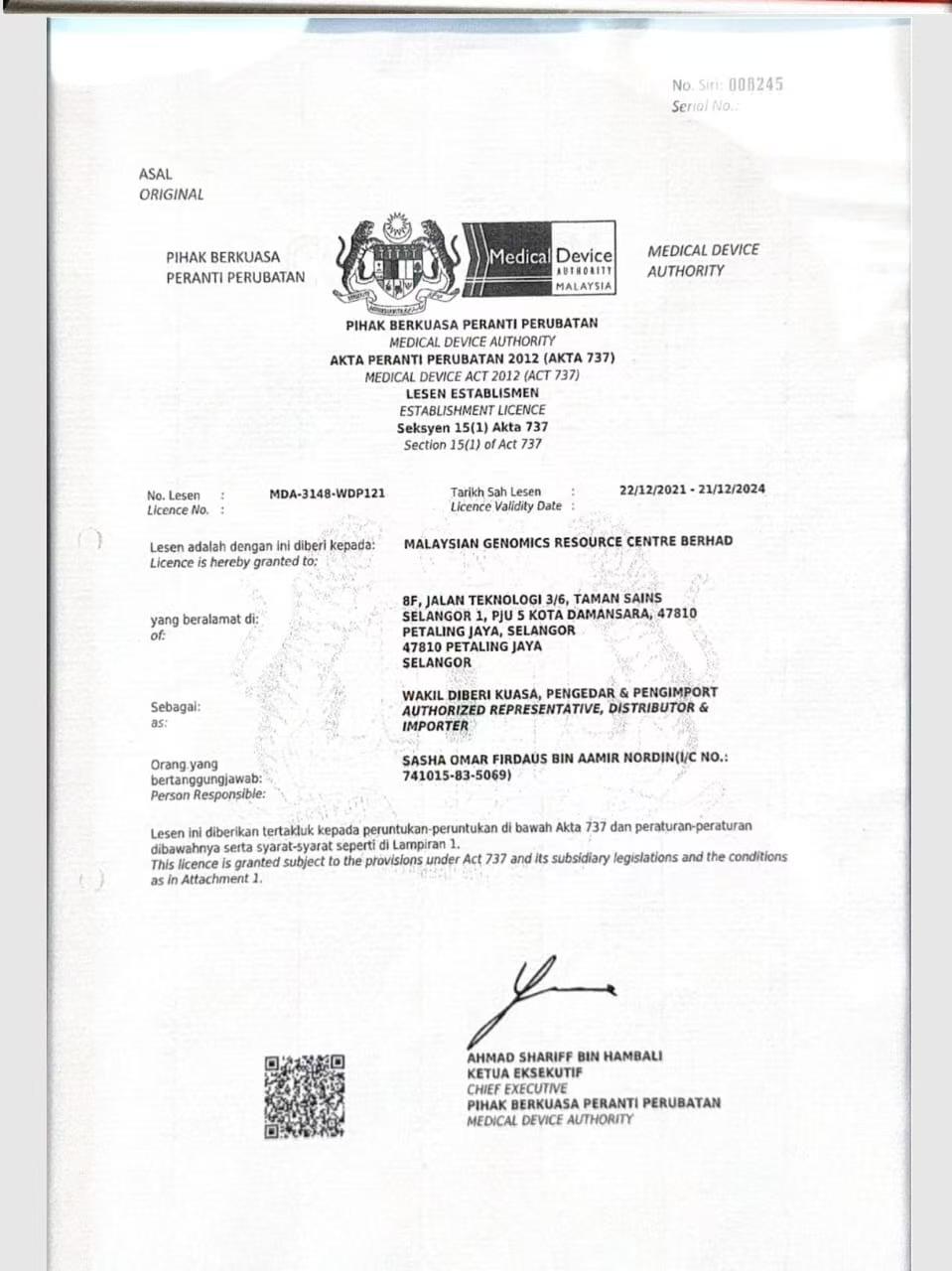 马来西亚基因组资源中心有限公司的相关证书文件。UQAS颁发的证书,初始发证日期2022年3月31日,有效期从2024年3月31日至2025年3月30日;还有马来西亚医疗器械管理局颁发的机构许可证,许可证号MDA - 3148 - WDP121,有效期2021年12月22日 - 2024年12月21日。