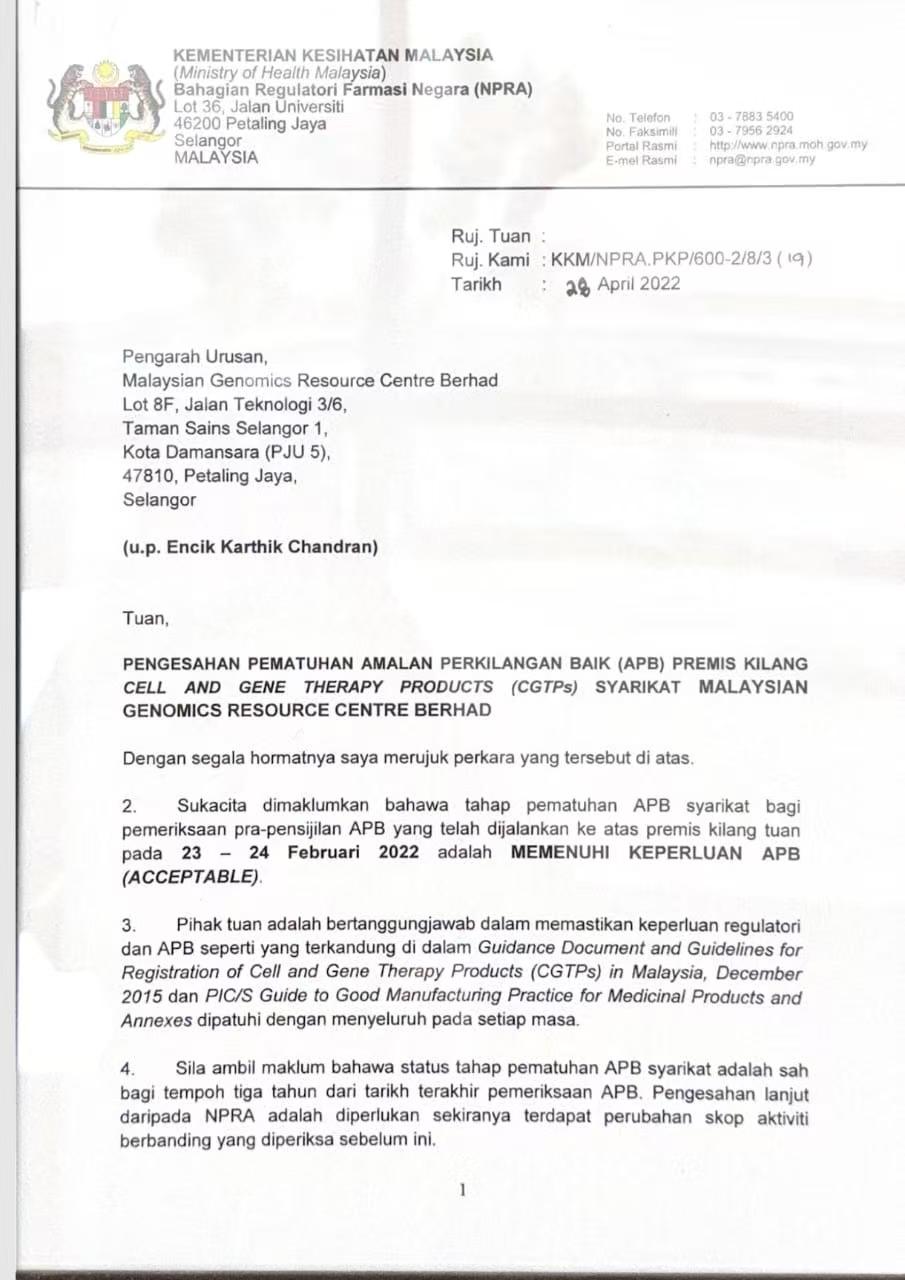 这是马来西亚卫生部下属国家药品监管机构(NPRA)致马来西亚基因组资源中心有限公司的信函,内容为该公司细胞和基因治疗产品生产场地符合良好生产规范(APB)检查要求,合规状态有效期三年。