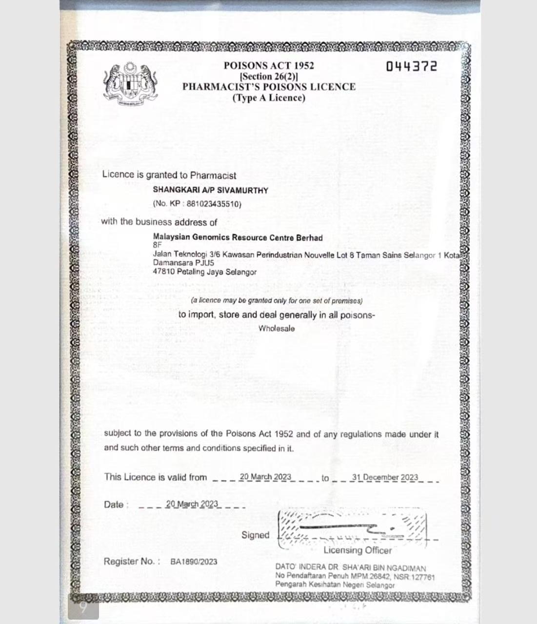 马来西亚基因组资源中心有限公司相关证照。有药剂师毒药A类许可证,颁发给Shangkari A/P Sivamurthy,有效期2023年3月20日 - 12月31日;还有符合ISO 17025:2017标准的实验室管理体系注册证书
