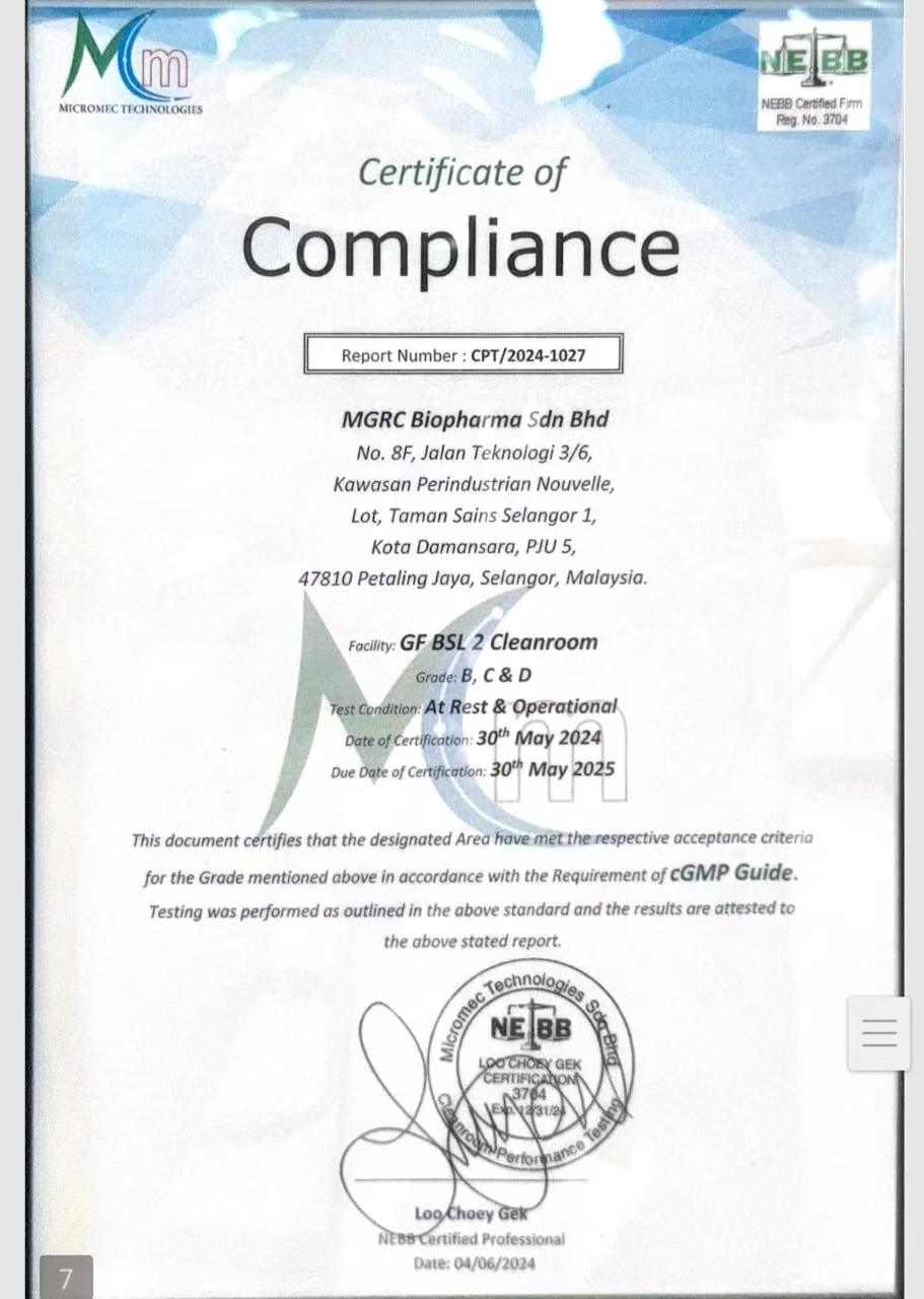 MGRC Biopharma Sdn Bhd的合规证书,报告编号CPT/2024 - 1027,涉及GF BSL 2洁净室,等级为B、C和D,测试条件为静态和运行状态,认证日期2024年5月30日,有效期至2025年5月30日,证明该区域符合cGMP指南要求。